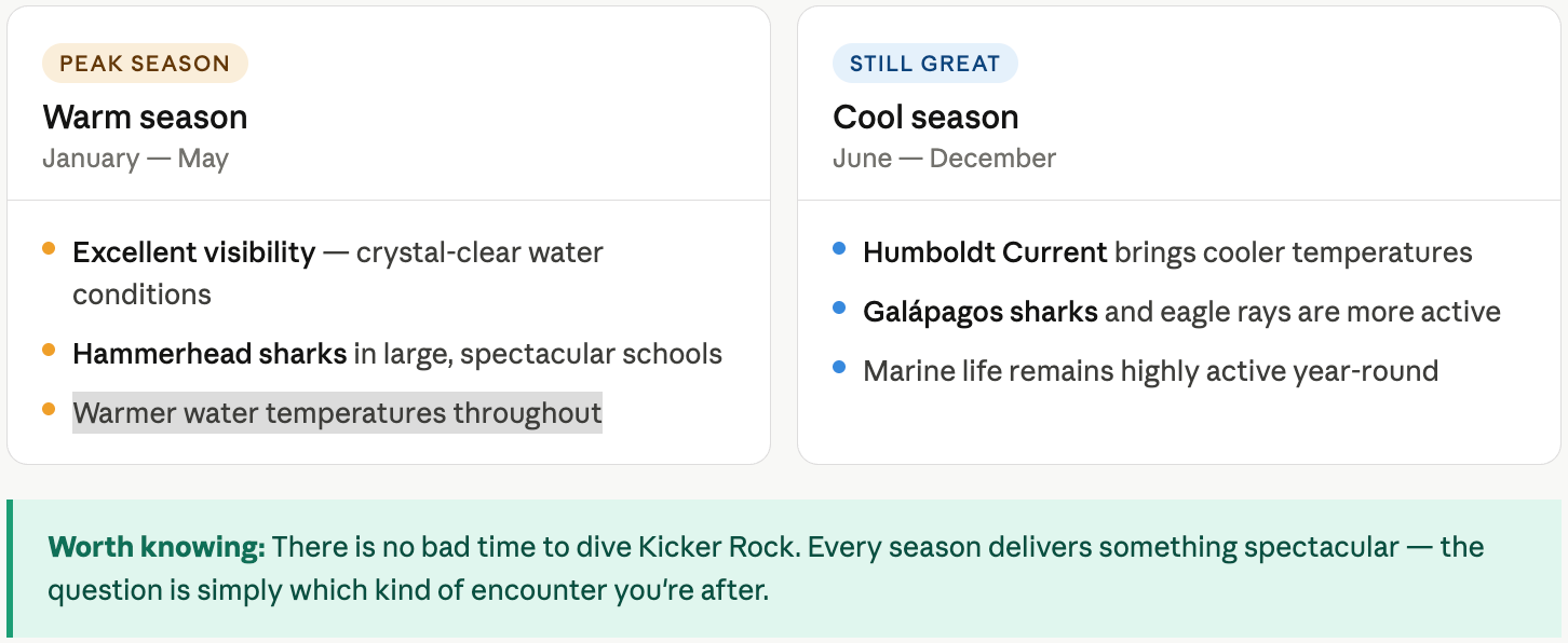 Worth knowing: There is no bad time to dive Kicker Rock. Every season delivers something spectacular, the question is simply which kind of encounter you're after.
